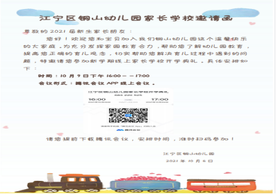 十月菊黄、秋高气爽、丹桂飘扬,春日播下的希望此时正在收获累累硕果。日渐长大的宝贝们,离开父母的怀抱,投入到幼儿园的生活,开启一段崭新的人生旅程。为加强家园联系,促进家园共育,充分发挥幼儿园对家庭的教育辐射与引领作用;让家长全面了解幼儿园各项工作及发展规划,推动家园形成共同发展愿景。铜山幼儿园于2021年10月9日下午,利用腾讯会议APP,以“云端”线上的形式召开了新学期家长学校开学典礼。